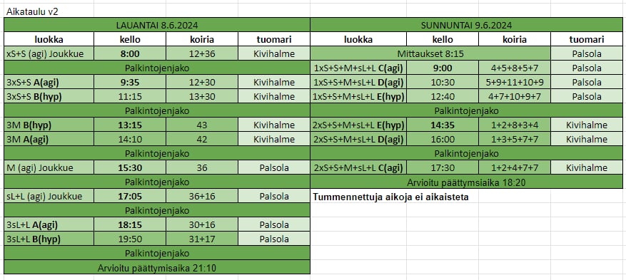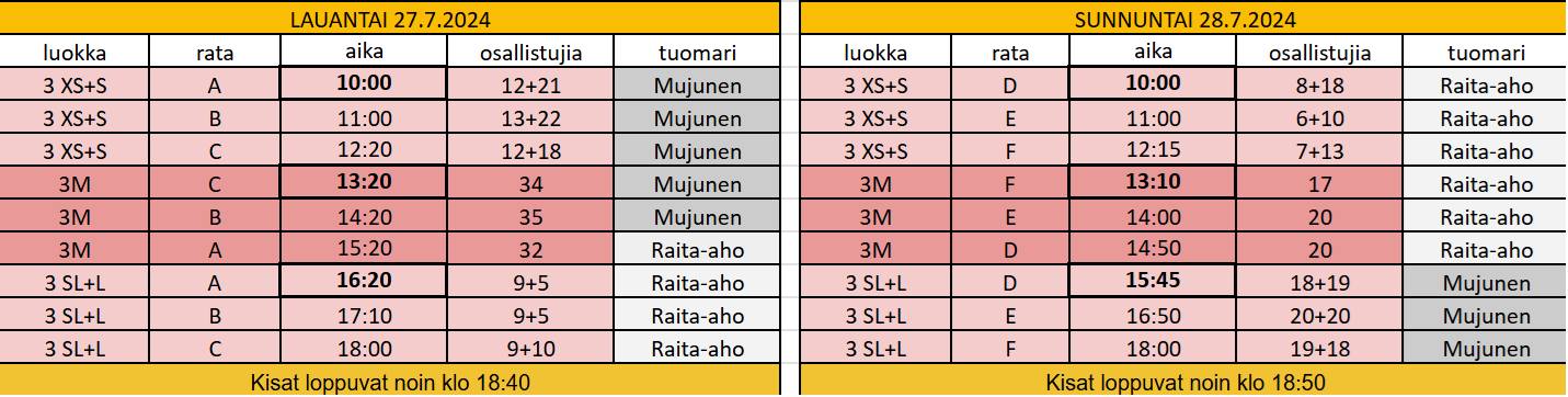 Tuomareina kisoissa Salme Mujunen ja Tommi Raita-aho. Tarjolla 2 agirataa ja 1 hyppyrata kolmosluokille.