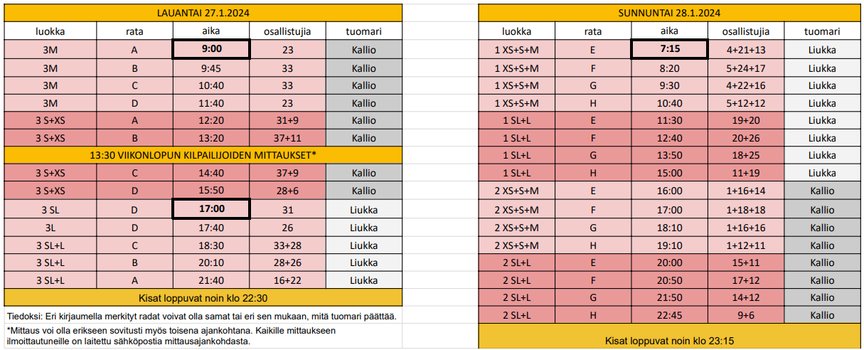 Aikataulu sekä luokka-ja tuomarijako: