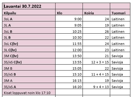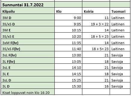 *Jo kisanneet koirat ovat mölliradoilla kilpailun ulkopuolisia, mutta saavat ilmoittautua mölliradoille.